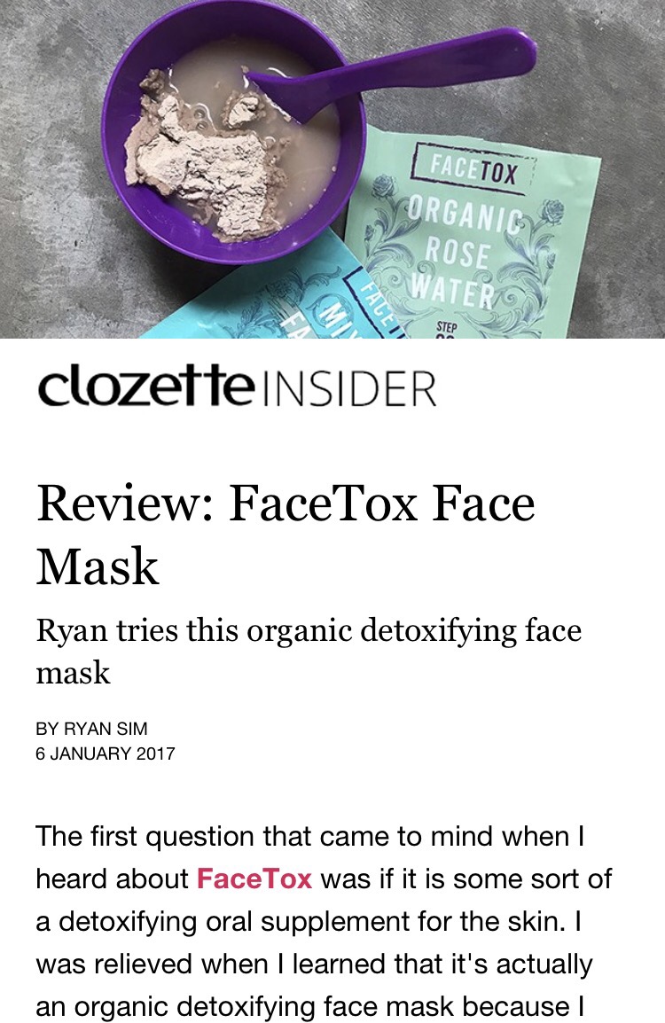 Anyway, Clozette (an online beauty & lifestyle community I am an ambassador of) recently sent me the U.K face mask, FACETOX, which took the scene by storm when it was launched, to have me try it out and review it. Which I did, and the review proper is finally live on their site. Click on the picture below to go directly to the review proper’s page on Clozette now!